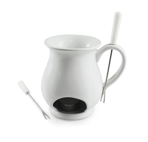 Ceramic Chocolate Fondue Mug - Melting Butter Pot with Fork, Cheese Warmer Cup, Butter Fondue Heated (White, NO CANDLE) 0808