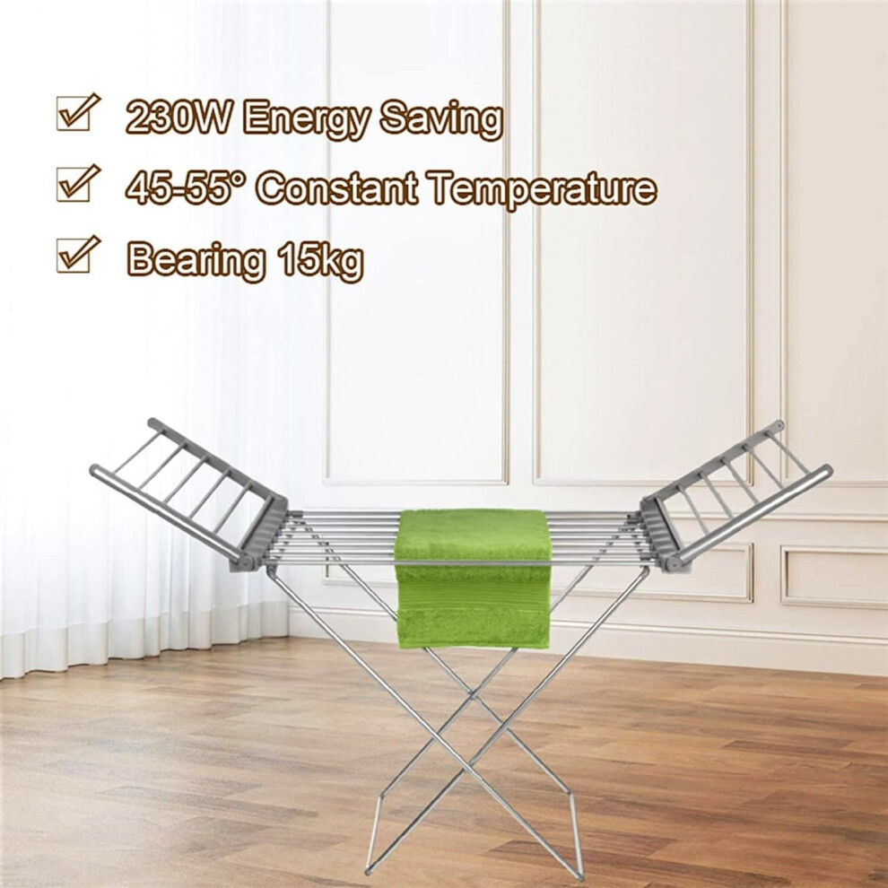 DWD Electric Heated 230w Clothes Airer with Wings Indoor Rack Stable Legs 5 Min Heating 45-55C Constant Temperature Max Load 15Kg Foldable Design