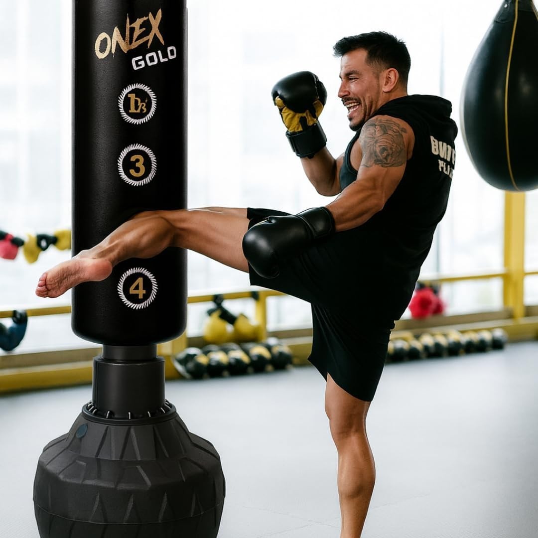 LEKÄRO Free Standing Punch Bag with Boxing Gloves, Heavy Boxing Bag with Stand for Adult Teens, Kickboxing Bag for MMA Muay Thai Fitness (Gold Black)