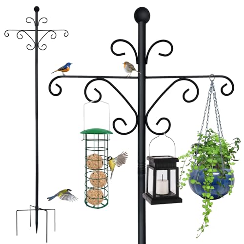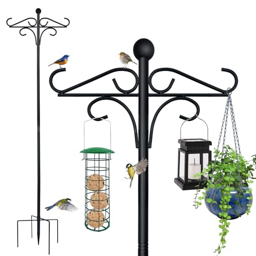 Bird Feeding Station Stand, Free Standing Feeder Poles and Hangers Heavy Duty Shepherds Hooks for Hanging Bird Feeder, Garden Lights, Basket, 193cm, Black 1 Pack