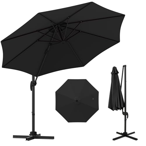 TANGZON 3M Cantilever Parasol, Heavy Duty Offset Umbrella with Cross Base, 8 Ribs, 5 Adjustable Tilt, 360° Rotation & Crank Handle, Outdoor Market Umbrella Sun Shade Canopy for Backyard Garden (Black)