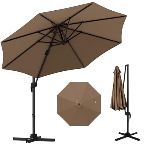 TANGZON 3M Cantilever Parasol, Heavy Duty Offset Umbrella with Cross Base, 8 Ribs, 5 Adjustable Tilt, 360° Rotation & Crank Handle, Outdoor Market Umbrella Sun Shade Canopy for Backyard Garden (Brown)
