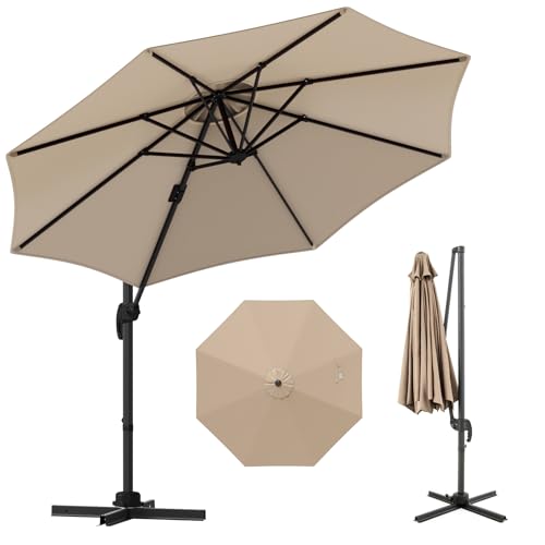 TANGZON 3M Cantilever Parasol, Heavy Duty Offset Umbrella with Cross Base, 8 Ribs, 5 Adjustable Tilt, 360° Rotation & Crank Handle, Outdoor Market Umbrella Sun Shade Canopy for Backyard Garden (Beige)