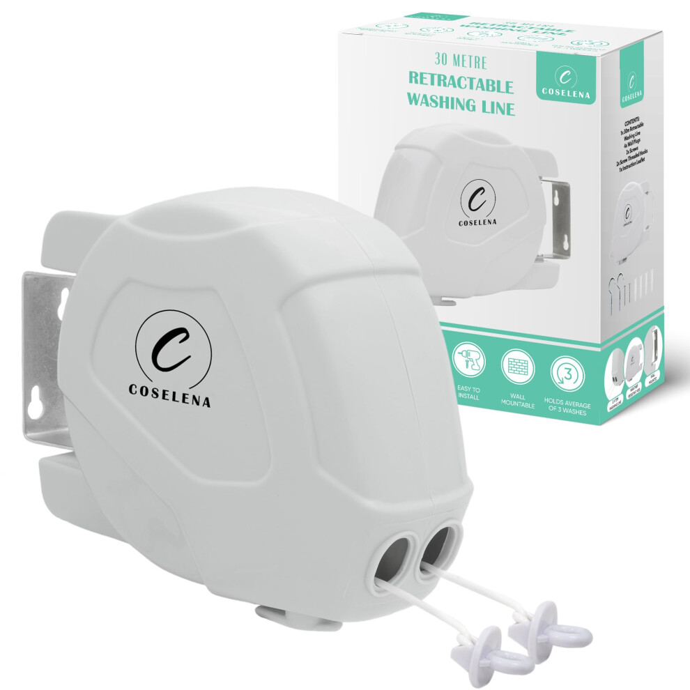 Coselena 30m Retractable Washing Line ? Heavy-Duty Twin Clothes Line with Hook ? Extendable Non-Slip Clothes Dryer for Indoor & Outdoor Use ? White
