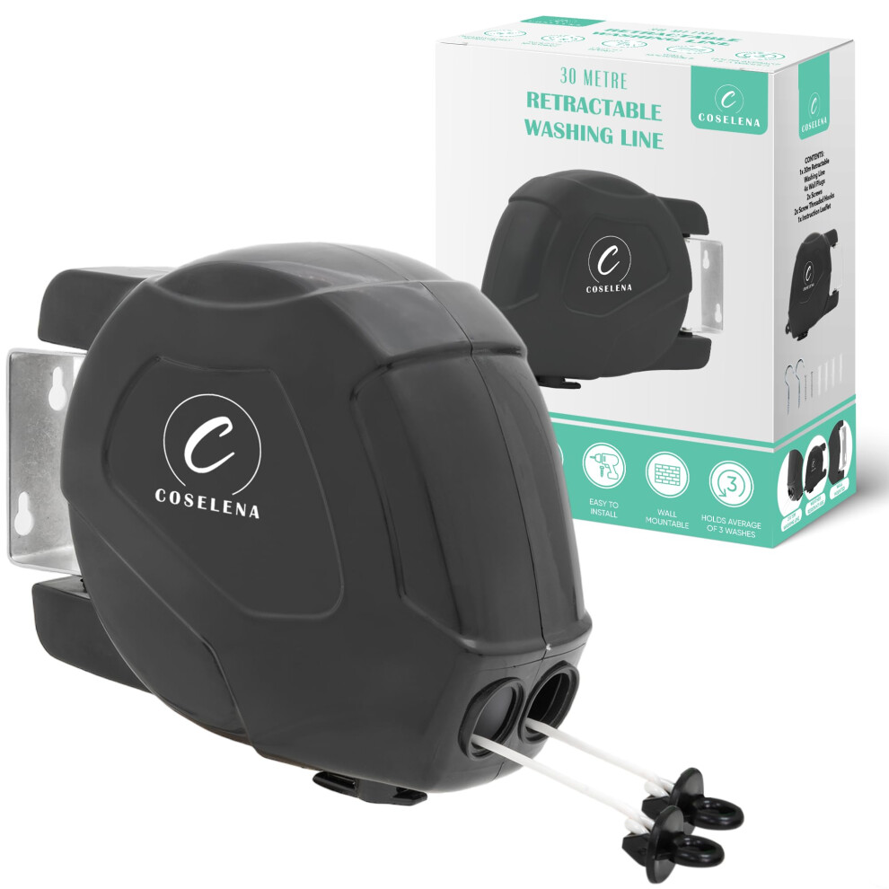 Coselena 30m Retractable Washing Line ? Heavy-Duty Twin Clothes Line with Hook ? Extendable Non-Slip Clothes Dryer for Indoor & Outdoor Use ? Black