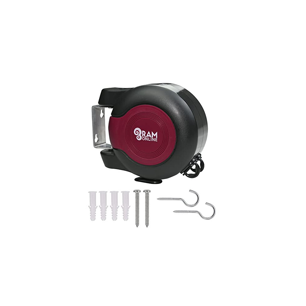Ram® 30 metre Retractable Reel Clothes Lines Washing Line with Twin Cable - Wall Mounted Heavy Duty Clothes Dryer 2 x 15m Lines of Drying Space, Burgundy