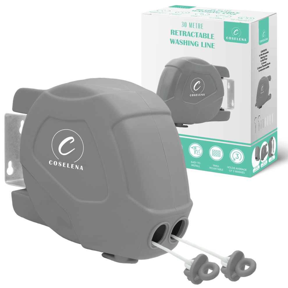 Coselena 30m Retractable Washing Line – Heavy-Duty Twin Clothes Line with Hook – Extendable Non-Slip Clothes Dryer for Indoor & Outdoor Use – White