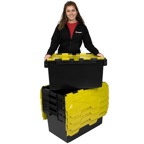Plastor Pack of 5 - Large Plastic 80 Litre Heavy Duty Storage Boxes (71 x 46 x 36.8cm) Black and Yellow LC3 Crates with Attached Hinged Lids