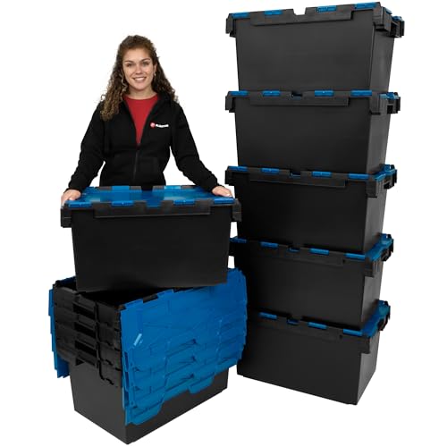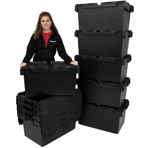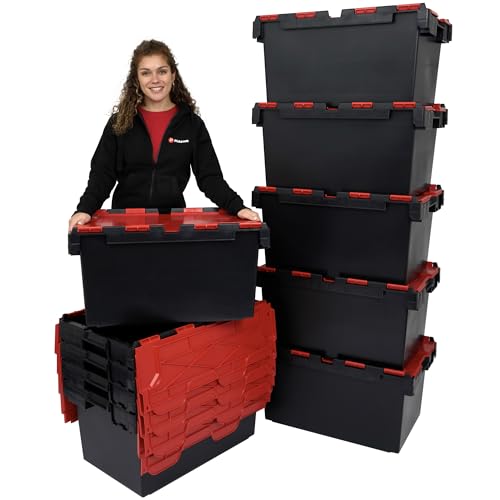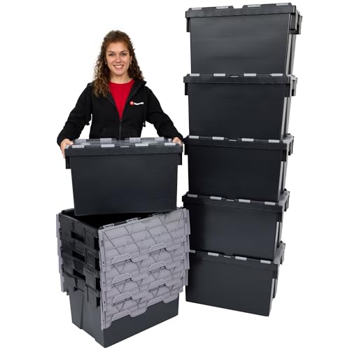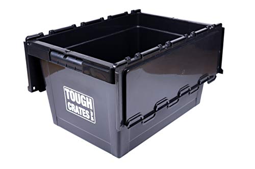 Tough Crates 5 x Heavy Duty Plastic Storage Boxes Black With Attached Lids Tote Boxes (60 Litre)