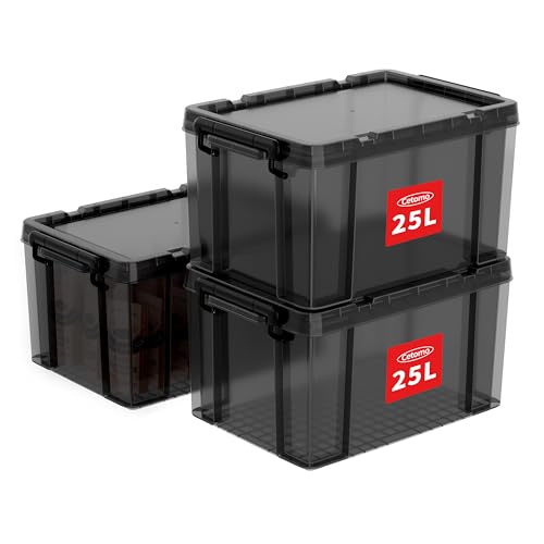 Cetomo 25L*3 Heavy-Duty Storage Boxes, Plastic Stackable Storage Box with Lids, Storage Bins with Reinforced Corners, Vertical Sides and Clip Closure, Durable, Sturdy, Transparent Black, 25L-3Pack