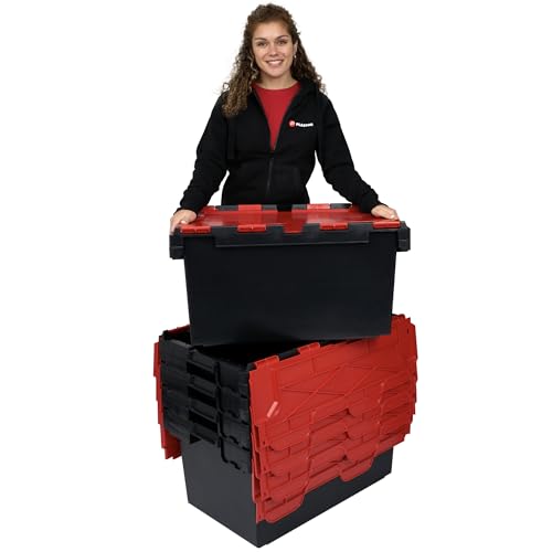 Plastor 5 x Large Plastic 80 Litre Heavy Duty Storage Boxes (71 x 46 x 36.8cm) Black and Red LC3 Crates with Attached Hinged Lids