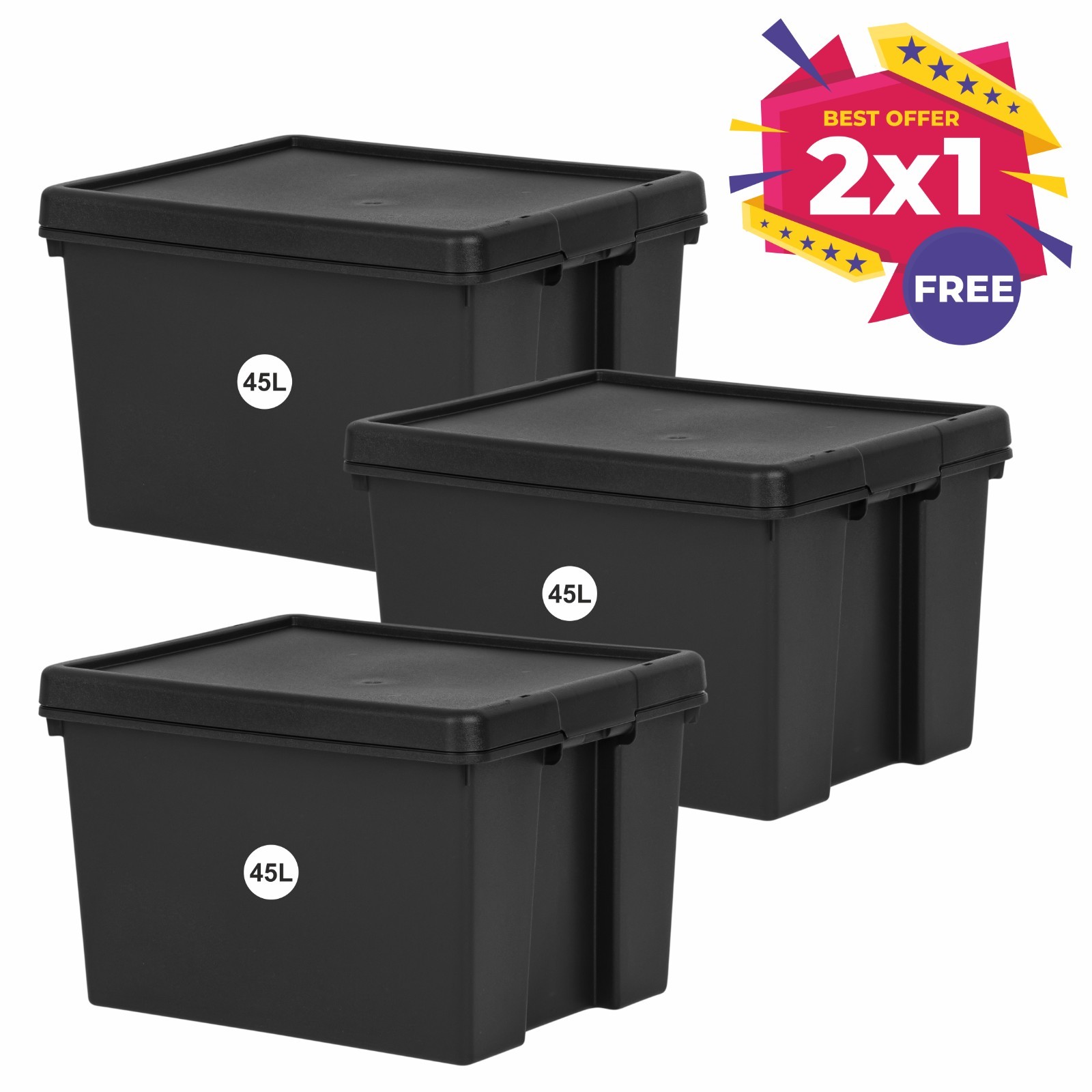 3 x 45L Heavy Duty Plastic BLACK Storage Boxes with Lids Commercial Containers
