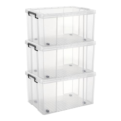 Cetomo 80L*3 Heavy-Duty Storage Boxes, Plastic Stackable Storage Box with Lids, Storage Bins with Reinforced Corners, Vertical Sides and Clip Closure, Durable, Sturdy, Transparent, 80L-3Pack
