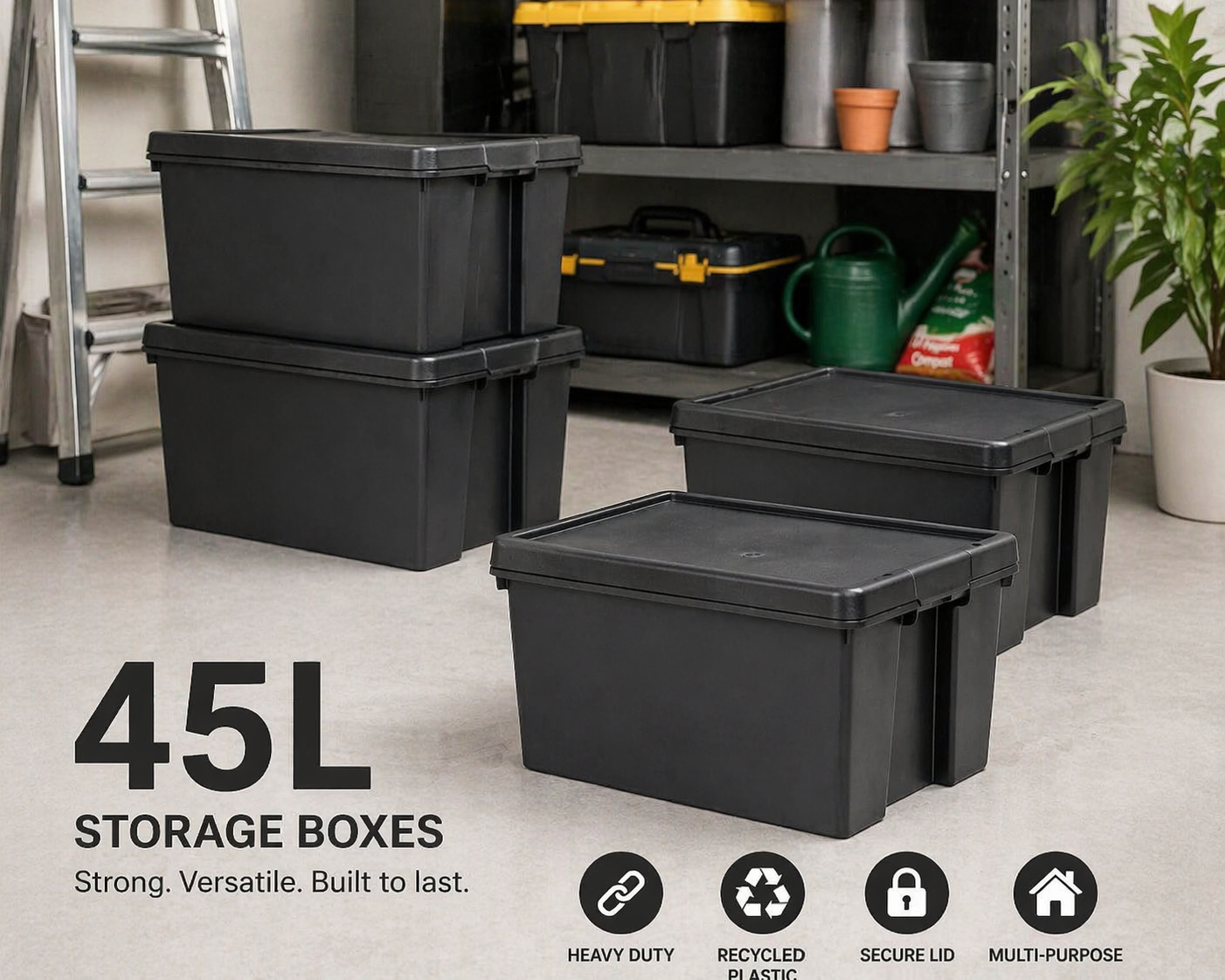 4 x Black 45L Heavy Duty Recycled Storage Boxes With Lids Plastic Containers UK