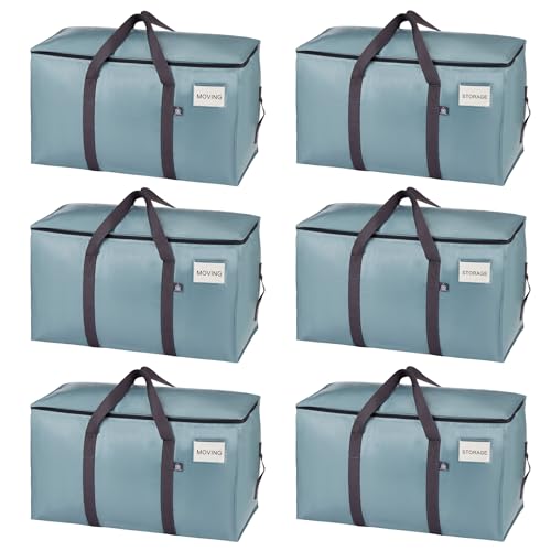 6 Pack Extra Large Moving Bags,Heavy Duty Storage Boxes with Lids,Storage Bags with Zippers,Backpack Straps&Handles for Moving House Clothes Bedding Duvet Storage,Christmas Decorations,Blue