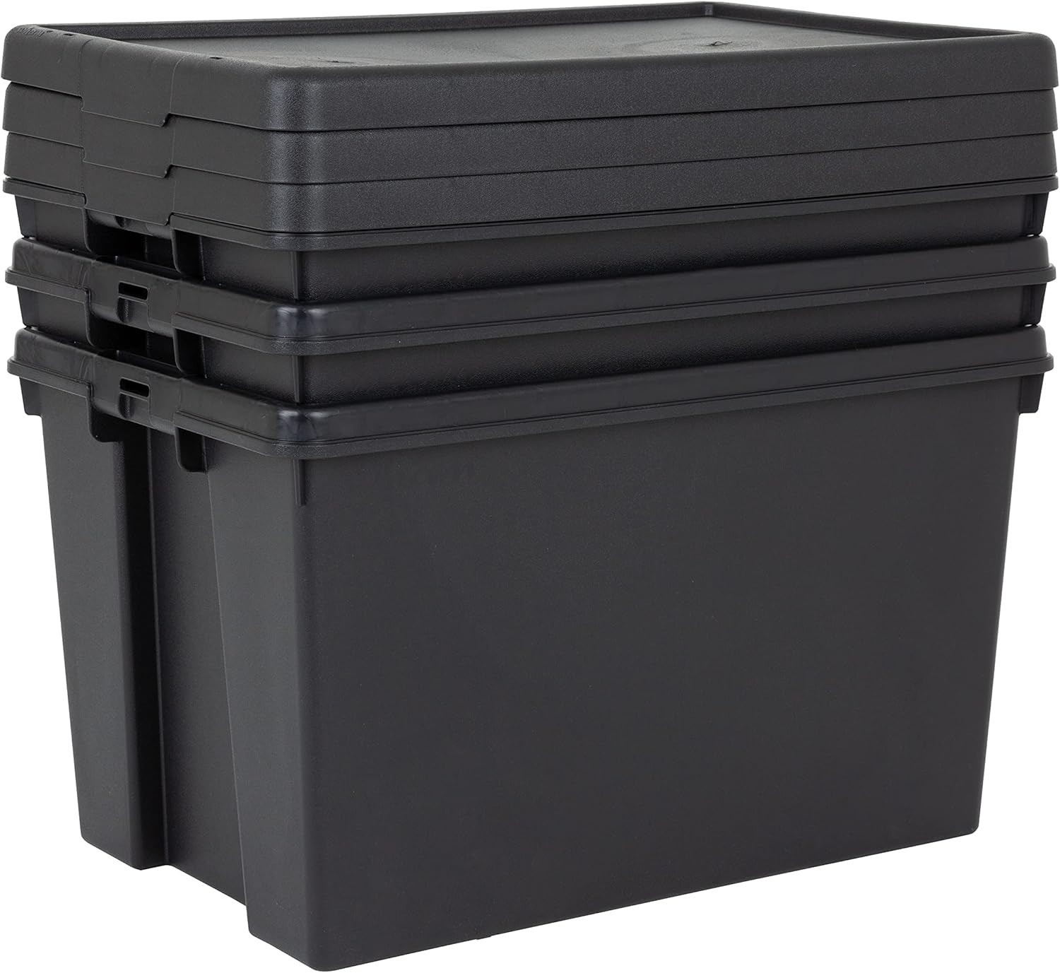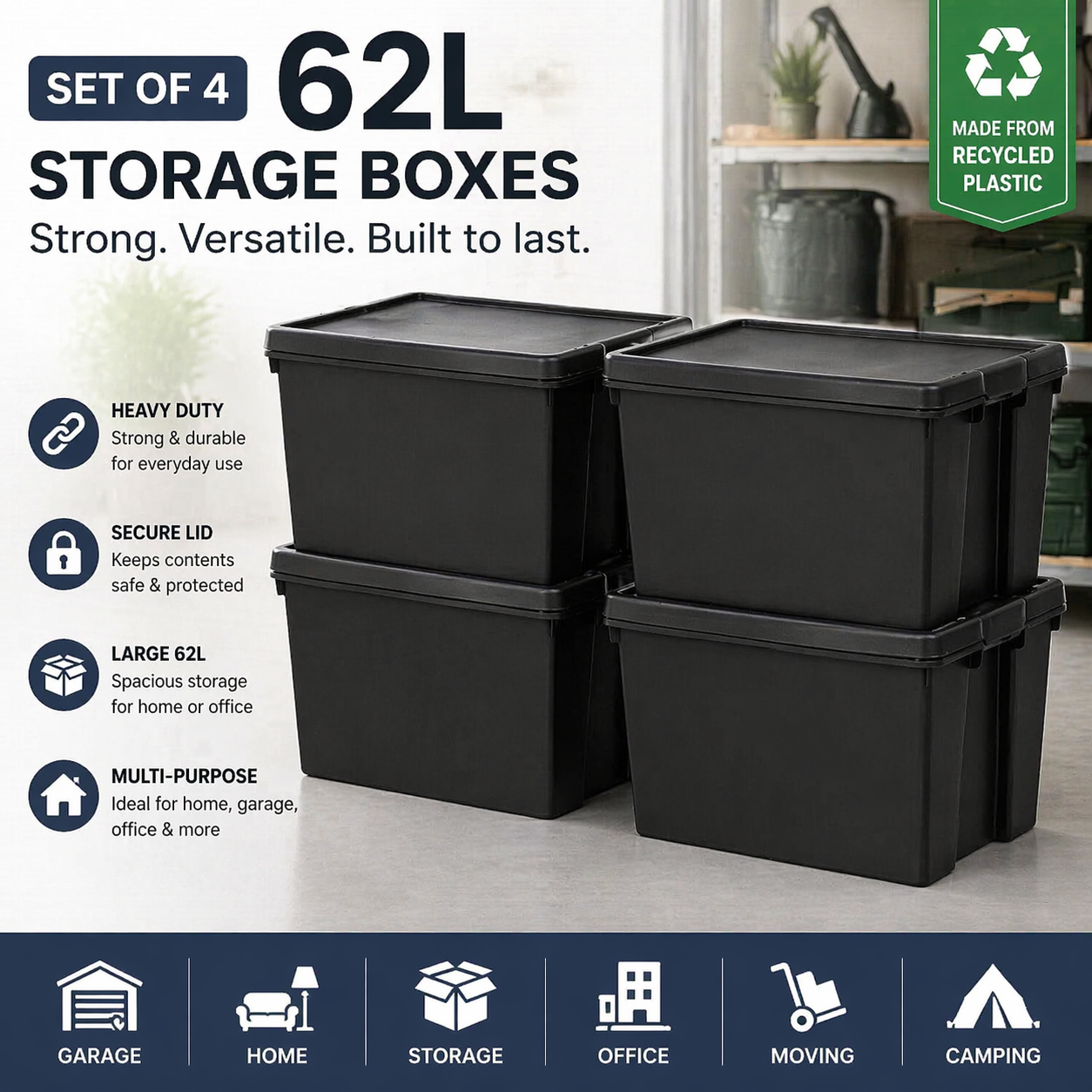 (Set of 4) 62L 62 Litre Recycled Heavy Duty Super Strong Storage Boxes Containers With Secure Lid Boxes Storage Containers Organizing Basket For Home Office Storage (62 LITRE, Black Bam)