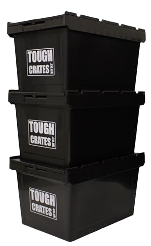 Tough Crates 3 x Heavy Duty Plastic Storage Boxes Black With Attached Lids Stackable (60 Litre)