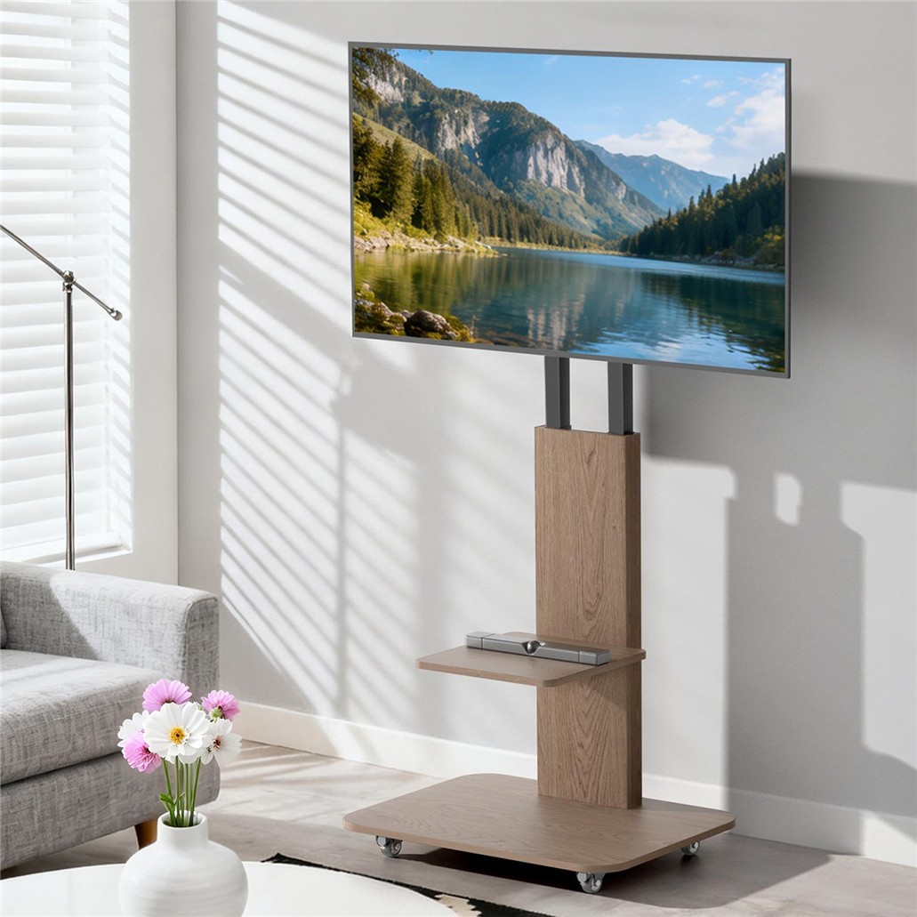 Heavy Duty TV Floor Stand Corner with 2 Wood Shelves for 32-75 Inch TV, 4 Wheels