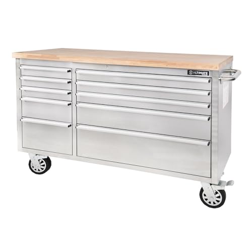 Ultimate Storage Stainless Steel Tool Chest on Wheels - 56″ - 10 Drawer Rolling Cabinet with Hardwood Worktop, Lockable Drawers, Ball Bearing Full Extension Slides, Heavy-Duty Castors
