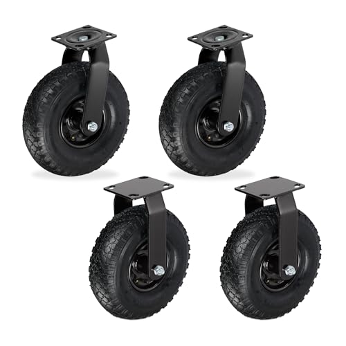 Relaxdays Set of 4 Heavy-Duty Pneumatic Wheels with Fixed and Swivel Castors, 3.00-4, Plate Mount, Black