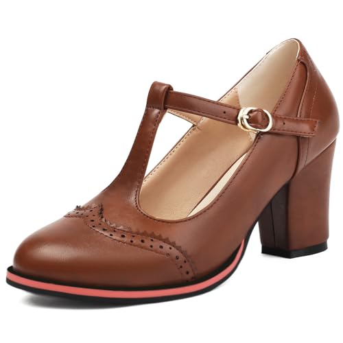 Gicoiz T Bar Mary Jane Womens Office Work Brogue Pumps Classic Business Block High Heeled Round Toe Ankle Strap Formal Shoes Brown Size 2-35