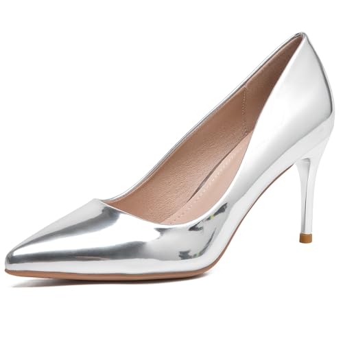 WUIWUIYU Women's Mid Kitten Heels Shiny Lovely Colors Pointed-Toe Dress Work Wedding Pumps Bridal Heeled Court Shoes Size 2 Silver