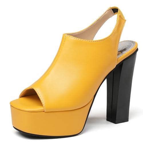 Gicoiz Peep Toe Block Heels Platform Women Slingback Sandals Party Slingback Elegant Ankle Strap Summer Wedding High Heeled Shoes Yellow Size 2-35
