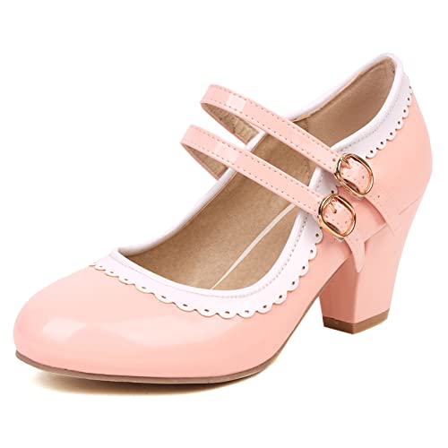 Lizoleor Patent Mary Jane Women Ankle Strap Block Heels Party Shoes Closed Toe Wedding High Heeled Pumps Prom Pink Size 2 UK/35