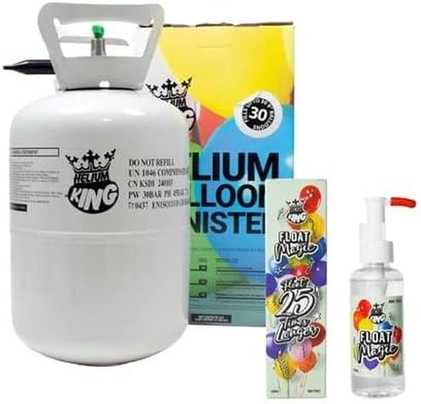 Helium King Disposable Helium Gas Canister Fills Up to 30 Latex or 14 Foil Balloons with Float Magic 100ml Balloon Treatment Bundle – Long Lasting Helium Balloon Kit for Parties, Weddings & Events