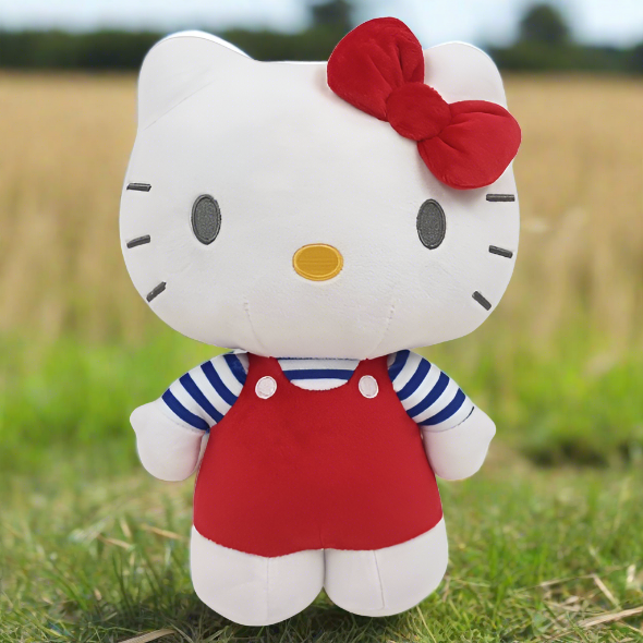 40cm Hello Kitty Standing Plush Pale Blue Dress with Pink Stripe Shirt