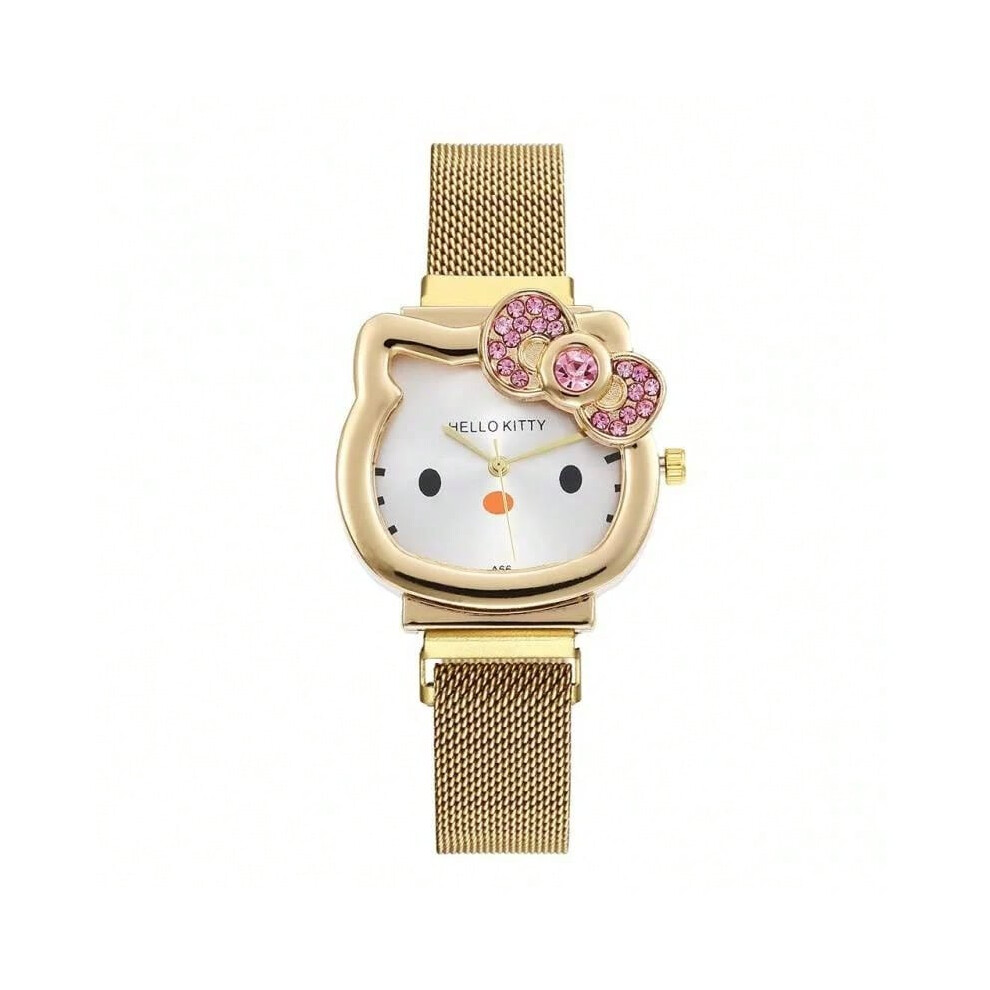 (gold) Hello Kitty Watch Metal Vintage Diamond Bow Ladies Watch Kawaii Girl Birthday Gift Cute Cartoon Anime Student Magnet Strap