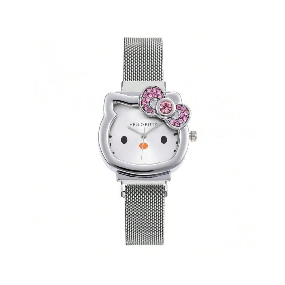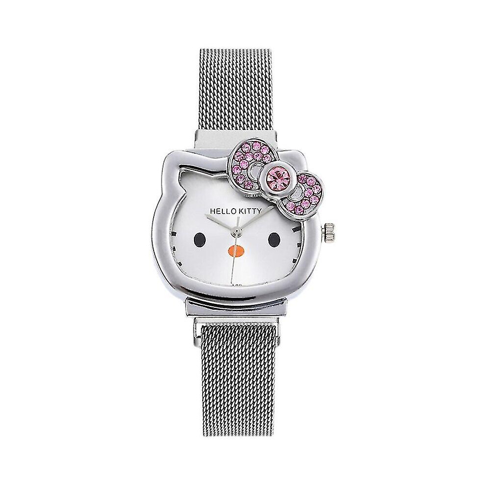(silver) Hello Kitty Watch Metal Vintage Diamond Bow Ladies Watch Kawaii Girl Birthday Gift Cute Cartoon Anime Student Magnet Strap