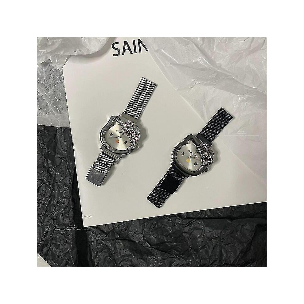 (black) Hello Kitty Watch Metal Vintage Diamond Bow Ladies Watch Kawaii Girl Birthday Gift Cute Cartoon Anime Student Magnet Strap