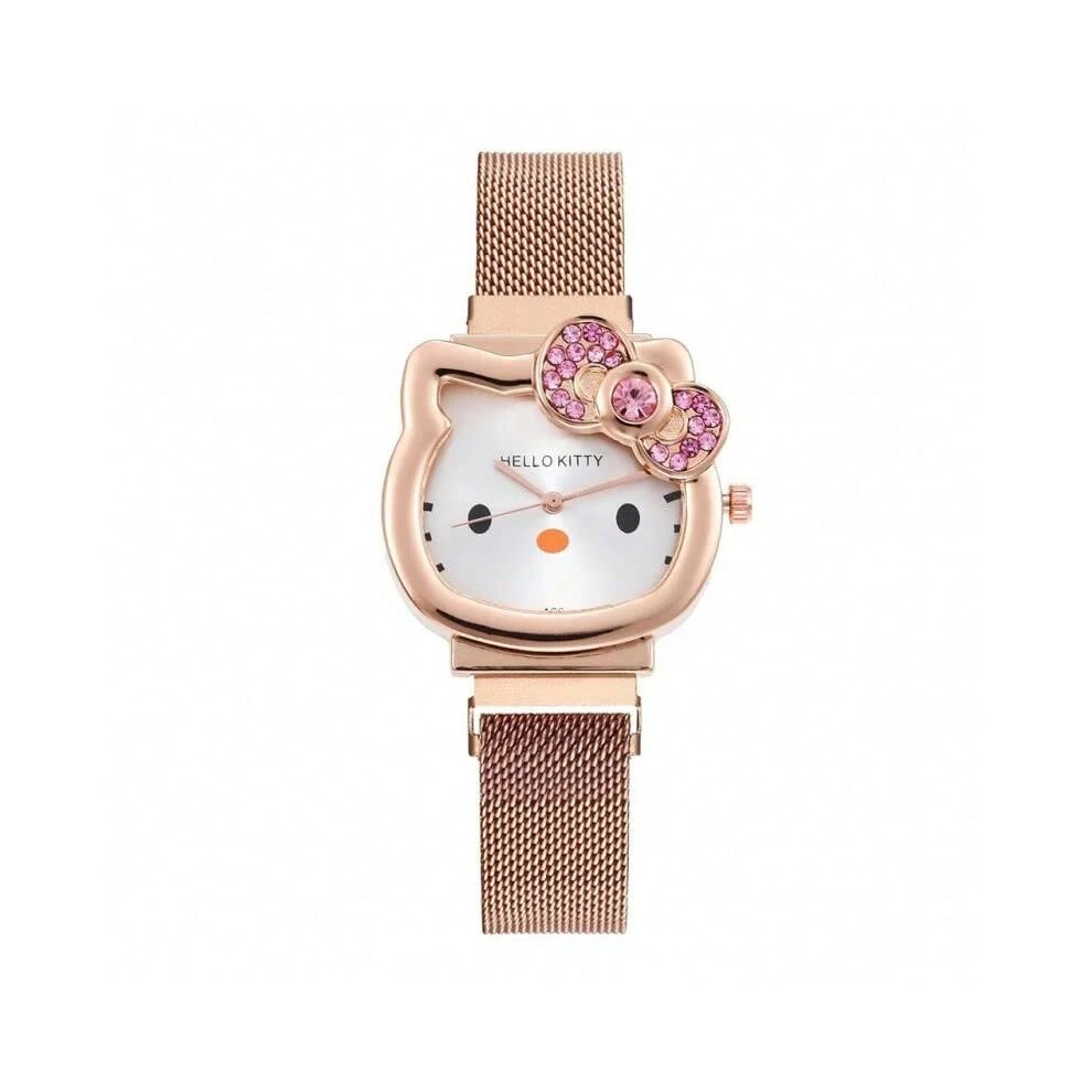 (rose gold) Hello Kitty Watch Metal Vintage Diamond Bow Ladies Watch Kawaii Girl Birthday Gift Cute Cartoon Anime Student Magnet Strap