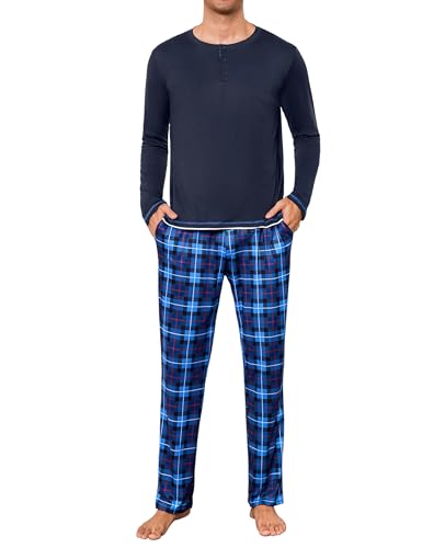 Leversic Mens Winter Pyjamas 2 Pieces Pyjama Set Henley Shirt Long Sleeve Top With Plaid Pajama Pants S-3XL(Navy Blue,S)