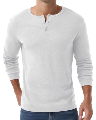 PrinStory Mens Henley T Shirt Long Sleeve Pullover Slim Fit T-Shirt V Neck Jumper Top with Button (White, L)