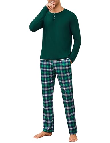 Leversic Mens Winter Pyjamas 2 Pieces Pyjama Set Henley Shirt Long Sleeve Top With Plaid Pajama Pants S-3XL(Dark Green,M)