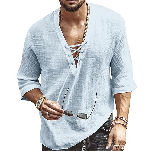 Mens Linen Shirts Short Sleeved V-Neck Drawstring Summer Cotton Henley Shirt Casual Beach Yoga Top Sky Blue 4XL