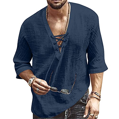 Rodawu Mens Linen Shirts Short Sleeved V-Neck Drawstring Summer Cotton Henley Shirt Casual Beach Yoga Top Navy Blue M