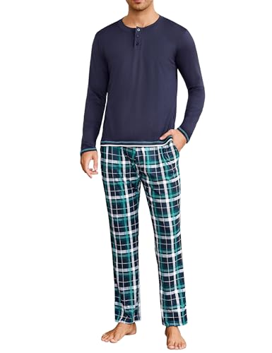 Leversic Mens Winter Pyjamas 2 Pieces Pyjama Set Henley Shirt Long Sleeve Top With Plaid Pajama Pants S-3XL(Navy Blue,M)