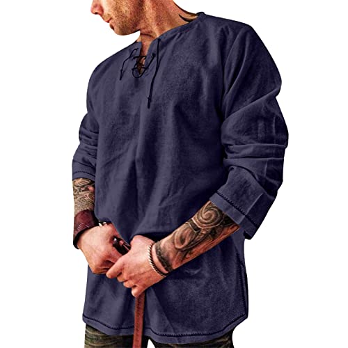 Mens Shirts Fashion Cotton Linen Henley Shirt Casual Hippie Beach Long Sleeve T Shirts Yoga Top Navy Blue 3XL
