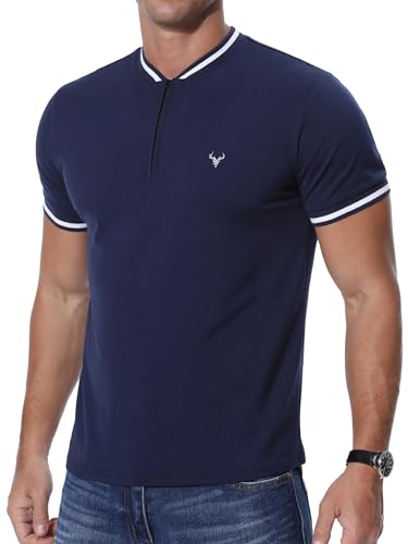 KUYIGO Mens Zip Henley T-Shirt Deer Head Embroidery Tennis Short Sleeve Top Regular Slim Fit XXL Navy