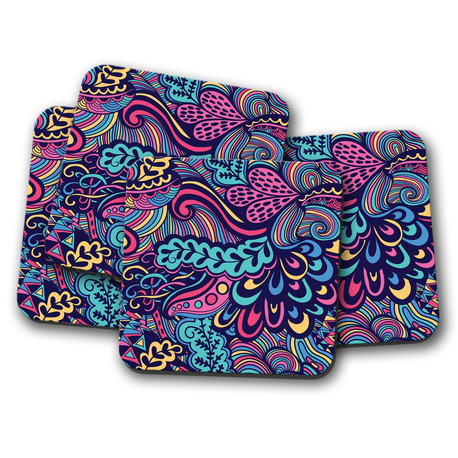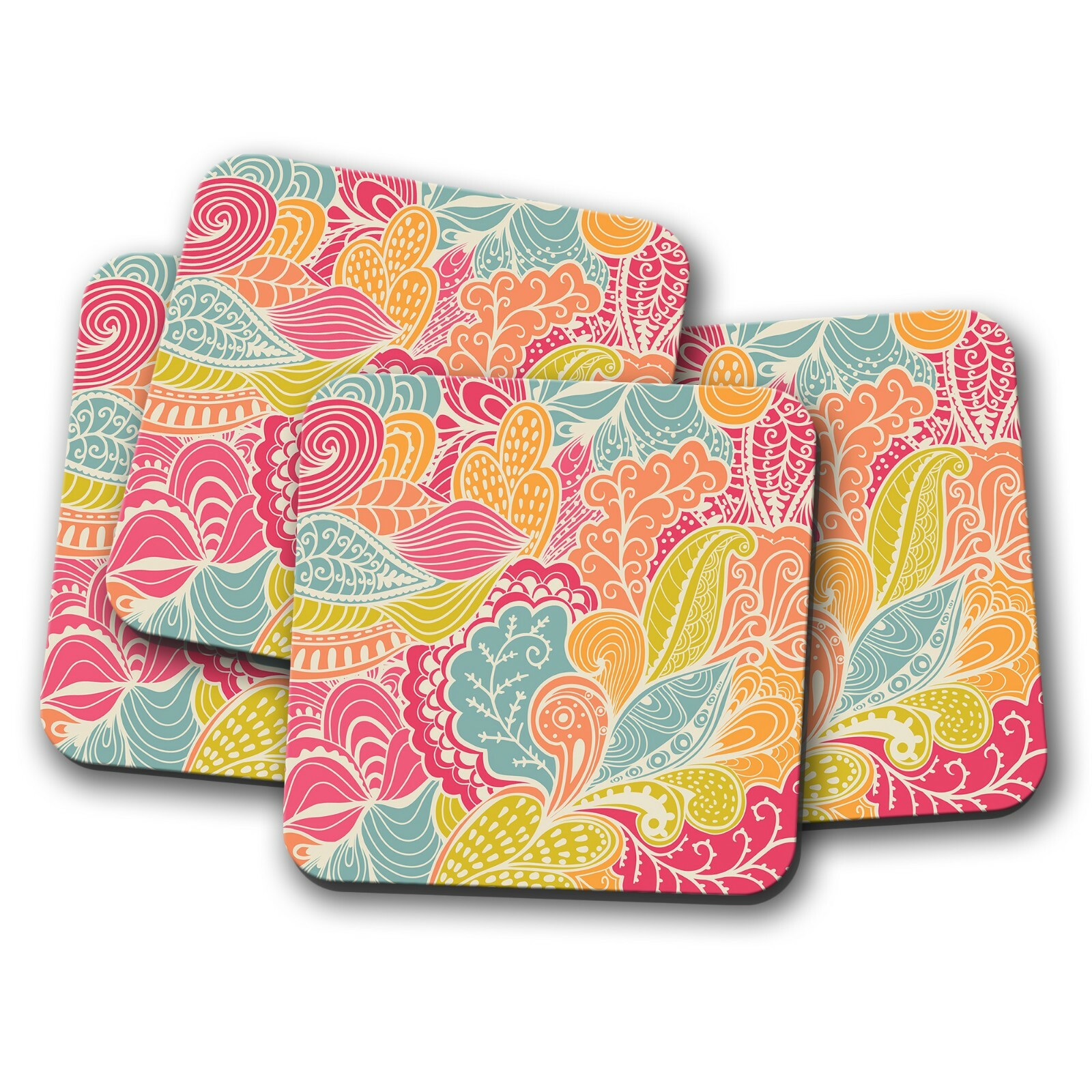4 Set - Colourful Pastel Henna Designs Coaster - Flowers Tattoo Cool Gift #12822