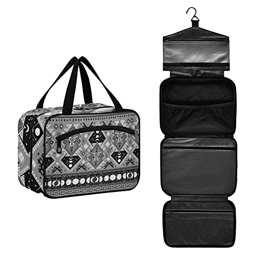 Indian Tribal Ornament with Bull Skulls Aztec Lace Henna Tattoo Style Hanging Wash Gargle Toiletry Bag Travel Cosmetic Makeup Case Organizer Storage Large Portable