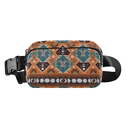 Oyihfvs Indian Tribal Ornament with Bull Skulls Aztec Lace Henna Tattoo Adjustable Fanny Waist Pack Pouch, Waterproof Runners Sports Waist Pack Wallet for Sports Hiking Fitness Cycling Gym Women Men