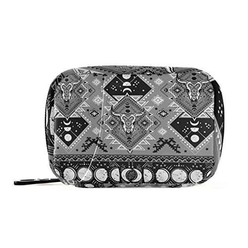 Indian Tribal Ornament with Bull Skulls Aztec Lace Henna Tattoo Style Women's Portable Makeup Bag with Side Handle, Zipper Cosmetic Bag, Men's Travel Cosmetic Bag, Toiletry Bag 10 x 4.5 x 4.9 inch