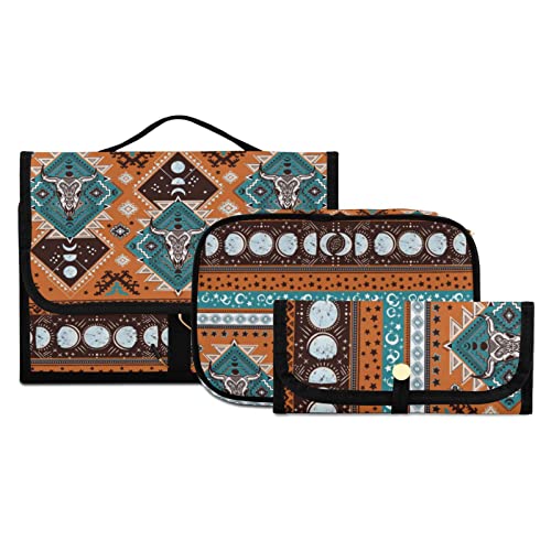 Indian Tribal Ornament with Bull Skulls Aztec Lace Henna Tattoo 3 PCs Set Toiletry bags, 1 Women's Travel Cosmetic Bag, 1 Hanging Toiletry Wash Bag, 1 Brush Case, Portable Makeup Storage Case