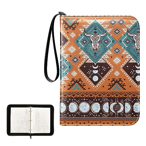 Oyihfvs Indian Tribal Ornament with Bull Skulls Aztec Lace Henna Tattoo PU Leather Card Storage Bag, With Zipper Waterproof 50 Pages 400 Slots Card Bag for Students Home School 15.74 x 9.64 inch