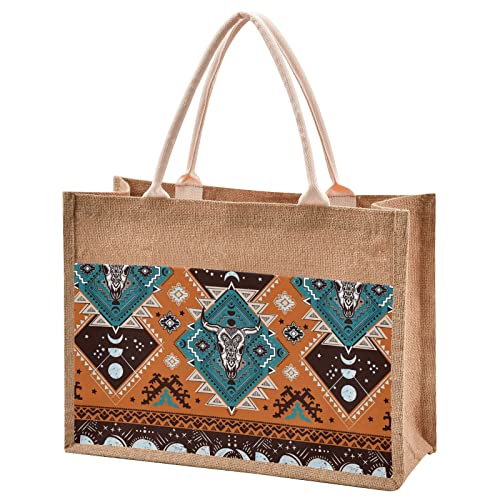 Oyihfvs Indian Tribal Ornament with Bull Skulls Aztec Lace Henna Tattoo Durable Burlap Bag with Handles, Zipper Jute Tote Reusable Bag Waterproof Lining for Shopping Work Travel 16.9 x 12.6inch