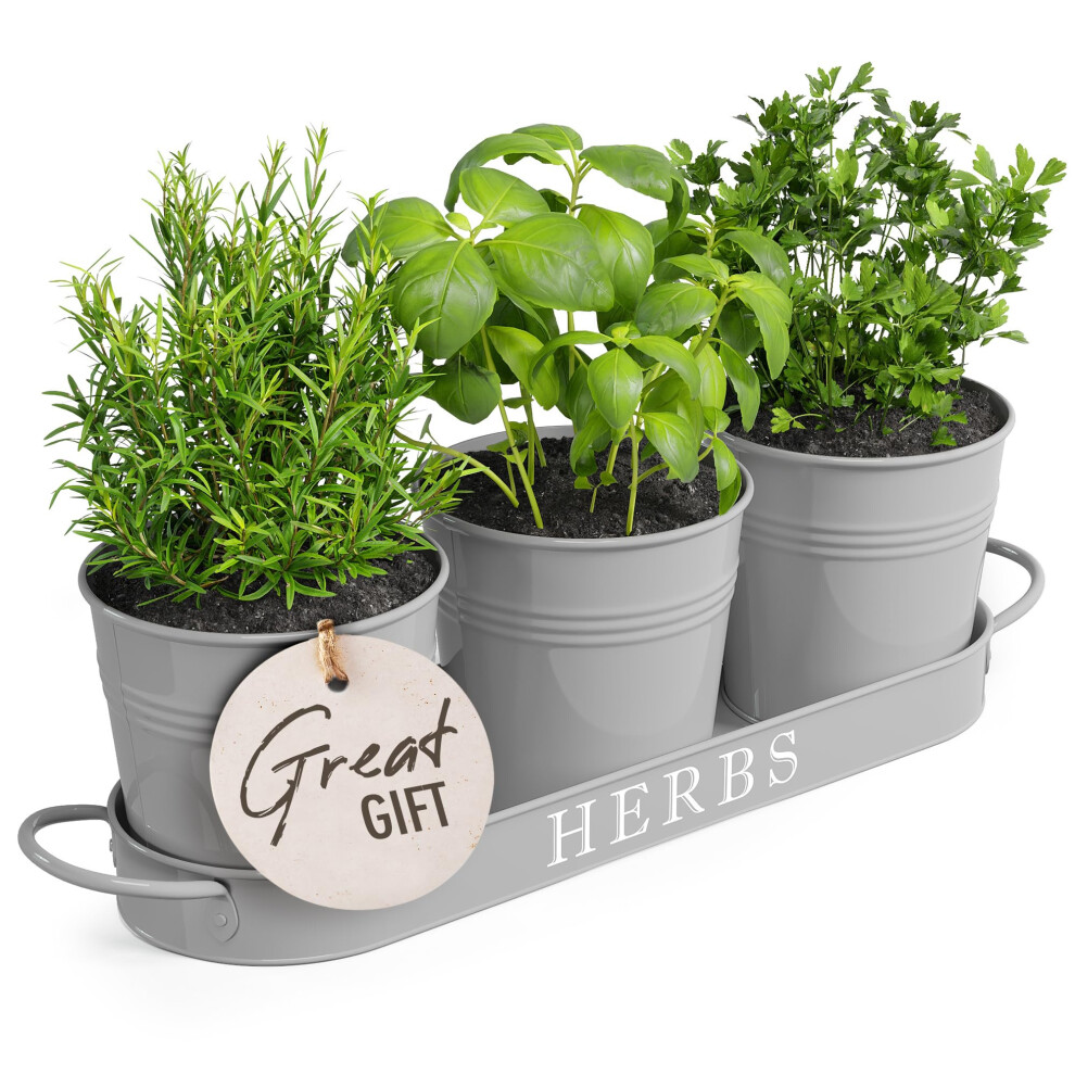 Barnyard Designs Indoor Herb Garden Planter Set with Tray, Metal Windowsill Plant Pots with Drainage for Outdoor or Indoor Plants, Grey, Set/3